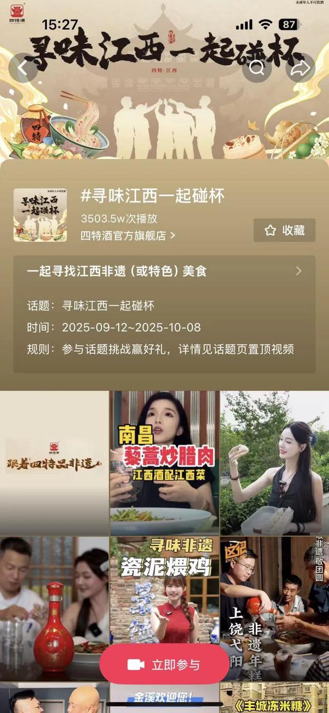 如果说达人探访是点燃烽火,那么如何让星星之火形成燎原之势?四特酒精准地抓住了抖音平台的社交脉搏,9月12日,在抖音发起了 #寻味江西一起碰杯# 挑战赛——只需一个“碰杯”的动作,分享日常生活中关于美食美酒的“小确幸”,就能参与挑战赛,与全网一起晒出“美好瞬间”。活动迅速从达人下沉至普通用户,无数江西儿女及在赣游子,通过拍摄自家餐桌、家乡美食与四特酒的“碰杯”瞬间,表达着对故土风物的热爱与自豪。截止10月8日,#寻味江西一起碰杯 抖音挑战赛总播放量达3500万,并多次登上抖音话题热搜榜。四特酒以“非遗美食”为桥梁,将人们日常生活中的美食和美酒与城市文化深度绑定,在传递品牌自身品质优势的同时,实现了对江西非遗文化的传承与弘扬,完成了从“品牌讲故事”到“用户共创故事”的完美跃迁。