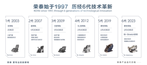 历经6次技术迭代,荣泰的发展史,堪称一部按摩椅核心技术的进化史:在按摩导轨上,实现了从无导轨到S型、SL型,再到更贴合人体曲线的“柔性导轨”的进化;在按摩机芯上,完成了从2D、3D到4D机芯,再到“双机芯”的跃升;荣泰还开创了一系列业界领先的专利技术,包括“换向零等待”“360°玲珑腿足系统”以及“Bi-Stretch拉伸²系统”等,不仅筑就自身坚实护城河,更成为按摩椅行业技术进步的重要推动力。