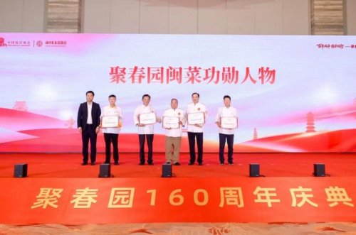 姚建明、林水俤、强振涛、罗世伟、卓明华五位闽菜大师被授予聚春园闽菜大师功勋证书,彰显了行业对技艺传承的高度重视。