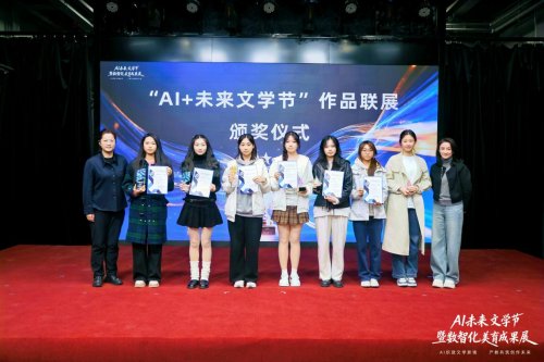 活动现场还为“AI未来文学节”作品联展的获奖者颁奖,共颁发包括AI视听文学、AI影像叙事、AI科创发明、AI教育先锋等在内的14个奖项,展示了从中小学生到高校师生在AI与文学融合创作方面的丰富成果。