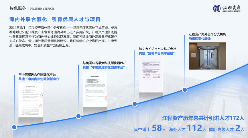目前,江程资产正将这一理念付诸实践,在新加坡JHub@20 Anson Singapore、马来西亚等关键枢纽建设本地化创新社区,并与中荷双边合作国际化平台共建“中荷离岸协同创新中心”、 与美国硅谷最大科技孵化器PNP共建“中美跨境孵化加速平台”、 与タカイジャパン株式会社共建“寰翎中日离岸基地”。通过“全球孵化、上海落地、产业加速”的模式,江程不仅助力国内科技企业稳健“走出去”,也正将海外先进技术、人才与项目“引回来”,初步形成了“以高水平开放促产业创新”的良性循环。