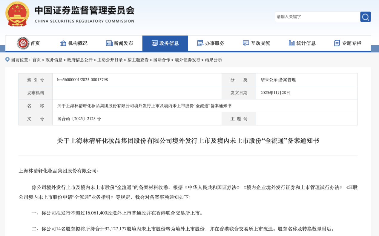 11月27日,中国证监会发布《关于上海林清轩化妆品集团股份有限公司境外发行上市及境内未上市股份“全流通”备案通知书》(简称“通知书”)。根据通知书,林清轩拟发行不超过1,606.1万股境外上市普通股并在香港联合交易所上市。