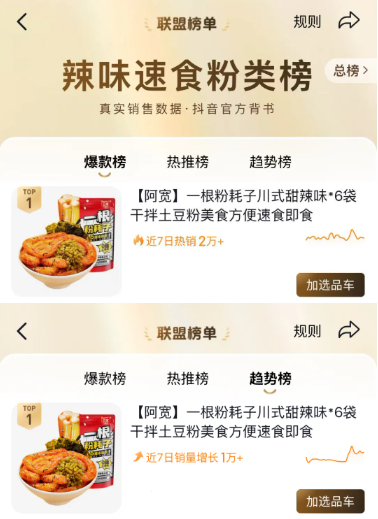 一根粉耗子荣登抖音辣味速食粉类爆款榜、趋势榜双榜榜首