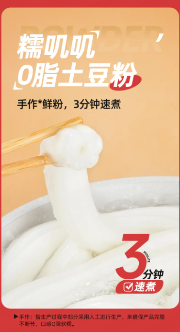同时,产品采用0脂非油炸配方和工艺,以土豆淀粉为主料,兼顾了健康性与口感满足感。