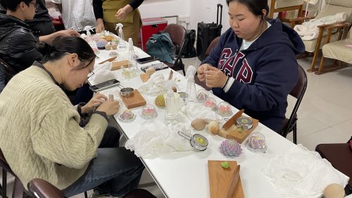 进入实操环节,讲师率先上手示范完整制作流程,并播放提前预录好的制作教程,使学员们能够清晰的看到操作手法,每一个动作演示都细致入微。遇到学员提出“花瓣边缘不整齐怎么办”“馅料包不住容易漏”等问题时,讲师则上前手把手指导,调整学员的手法姿势,确保每位学员掌握制作要点。