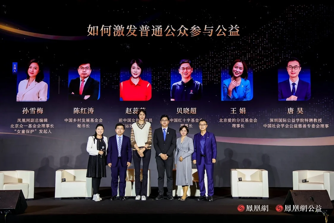 中国红十字基金会理事长贝晓超,中国乡村发展基金会秘书长陈红涛,前中国女排运动员、奥运冠军、作家赵蕊蕊,北京爱的分贝基金会理事长王娟,深圳国际公益学院特聘教授、中国社会学会公益慈善专委会理事唐昊参与讨论。