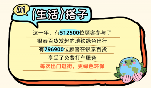 数据显示,全年累计有130多万位顾客参与银泰百货发起的地铁绿色出行活动或享受免费打车服务,让每一次出行更绿色、更环保。