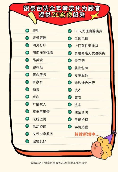 “生活的小美好,藏在商场的贴心服务里。”2025年,银泰百货为顾客免费包装礼物1.3万多份,清洗珠宝48万件,更换表带14万条,贴手机膜36万张,近56万位顾客在逛商场之余免费体验美甲或手部护理服务。从穿搭适配到形象焕新,这些细节服务让每一次到店都充满惊喜。