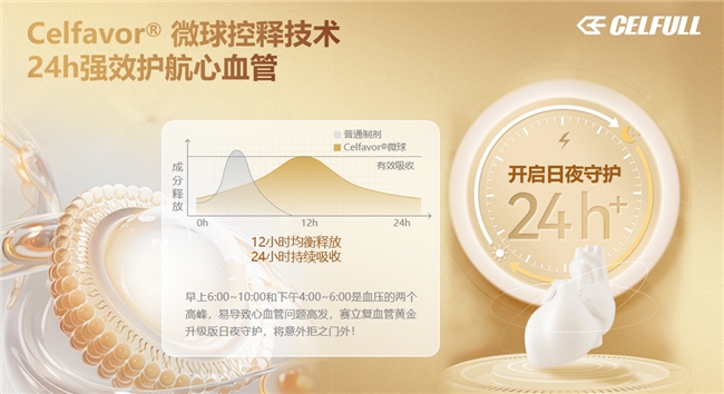 除了核心辅酶体系,赛立复的另一革新技术来自其自主研发的Celfavor®微球控释技术。传统辅酶产品往往只能在短时间内达到血药浓度高峰,随后迅速下降,而该技术能让活性成分以微球载体的方式在体内长达12小时均匀释放,使吸收过程保持平稳,并最终实现24小时持续吸收。这意味着心血管得到的是“全天候的能量补给”,而不是零散的短时刺激,从而真正形成一个稳定可靠的能量防护屏障。