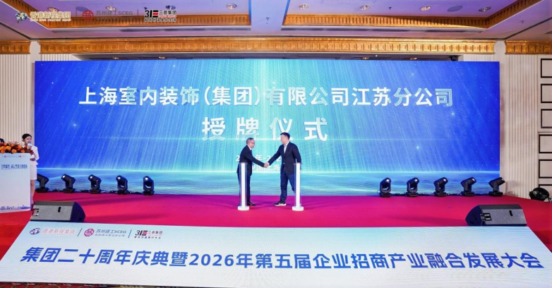 上海室内装饰(集团)有限公司董事长李斌随后致辞,对集团二十周年表示祝贺,并介绍了上海室装集团的全产业链资质与行业荣誉。他表示,基于对集团综合实力与胥德云董事长领导力的认可,选择在本次大会期间举行“上海室内装饰(集团)有限公司江苏分公司”授牌仪式,期待双方借长三角一体化机遇深化合作、共赢发展。