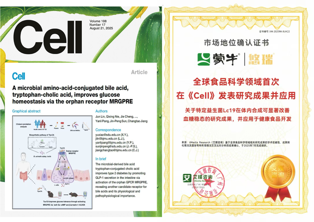 最具代表性的突破,是蒙牛自主研发的副干酪乳酪杆菌Lc19及其清晰的机制阐释。科研团队首次揭示该菌株可通过特定代谢物激活人体内一个全新的受体MRGPRE,从而安全、有效地调节血糖。这项具有里程碑意义的原创性应用基础研究,已发表于国际顶级期刊《Cell》,是全球食品科学领域首篇获该刊收录的应用型成果。基于这一精准机制,蒙牛推出悠瑞安糖盾益生菌粉,为血糖健康管理提供了新一代解决方案,该产品也荣获本次峰会“年度控血糖益生菌创新奖”。
