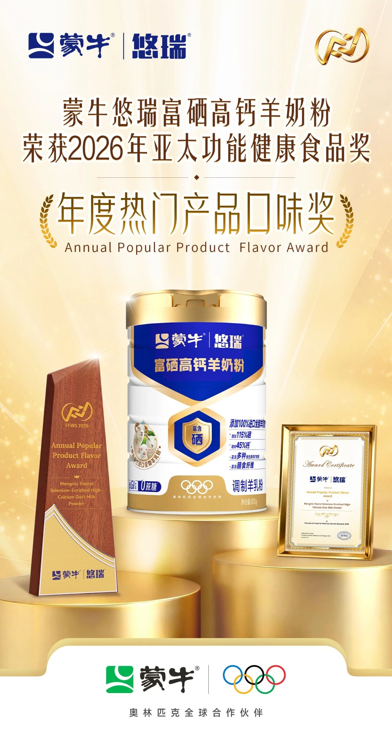 “产学研用”的理念,不仅应用于前沿科技的快速转化,也深刻体现在对消费需求的精准把握与产品力的极致打磨上。此次荣获“年度热门产品口味奖”的蒙牛悠瑞富硒高钙羊奶粉以“一杯好营养,一份真滋味”为理念,在精准营养配比的同时,通过工艺优化实现温和醇香的卓越口感,并以低GI、0蔗糖[5]的配方设计贴合当下健康饮食需求,让营养补充成为愉悦的生活体验,展现了蒙牛将精准营养与感官享受相结合的产品创新能力。