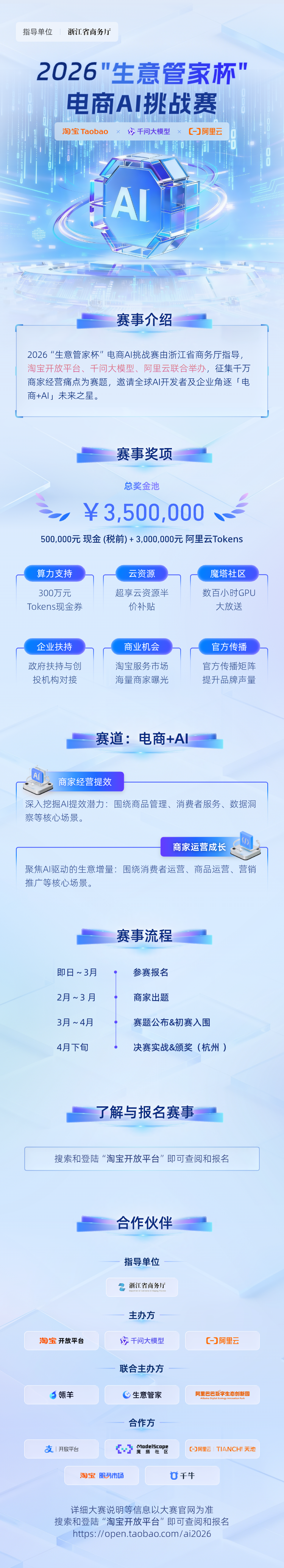 2月 8 日,由浙江省商务厅指导,淘宝开放平台、千问大模型、阿里云、瓴羊联合举办的2026“生意管家杯”电商AI挑战赛正式开放报名通道,参赛者登陆“淘宝开放平台”即可查阅和报名。(官网地址:https://open.taobao.com/ai2026)。