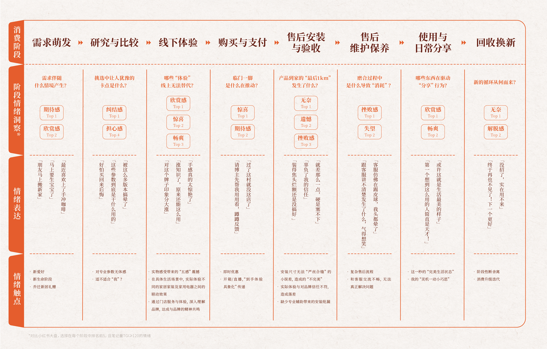 基于这一洞察,此次《白皮书》中,小红书构建展示了「家生活消费旅程情绪图谱」,将家生活消费拆解为需求萌发、研究比较、线下体验、购买支付、安装验收、维护保养、使用分享与回收换新八个阶段,并观察不同阶段中情绪结构的变化与触发点。