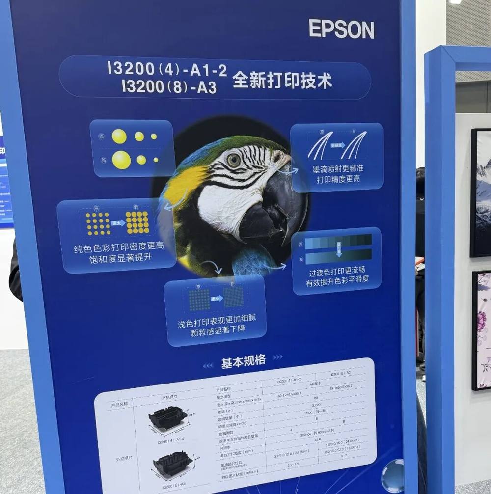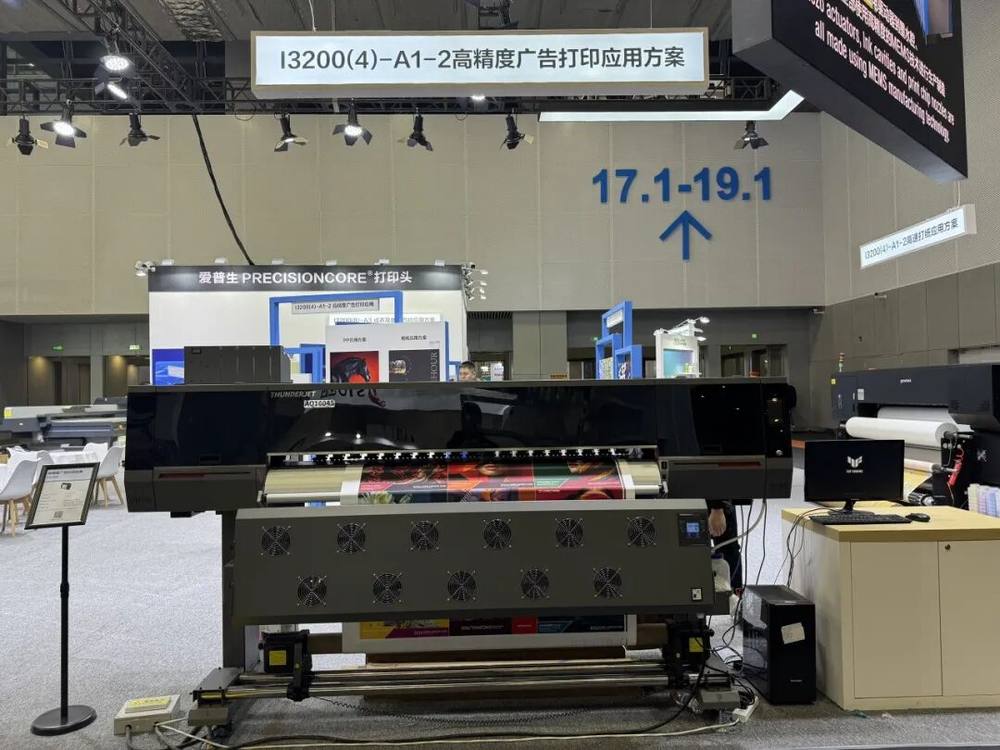 展会现场,爱普生在第一展示区重点展示搭载I3200-A1-2打印头的高精度户内打印方案。作为面向市场推出的全新产品,该型号代表爱普生在户内写真领域的最新技术成果。