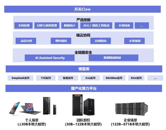 不久前,联想开天率先在开天X7h笔记本上成功跑通OpenClaw及国产类OpenClaw AI Agent本地部署,依托国产“CPU + NPU + GPU”本地异构算力,结合独家上下文压缩技术与安全隔离机制,为政企用户打造了一套兼具任务执行力、极致安全与简易部署的端侧AI办公方案,推动信创PC实现从“生产力工具”向“智能体载体”的关键跃迁。这一成功突破也有效化解信创AI智能体落地的安全难题,与国家“人工智能+”战略及新质生产力建设目标高度契合,为国产科技产业的高质量发展注入新动能。