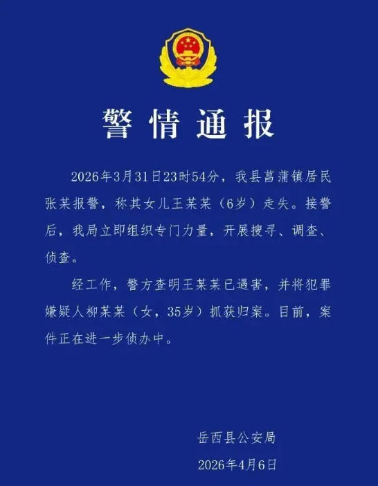 4月6日,安徽岳西县公安局发布警情通报:3月31日晚,女童王某某走失。经调查,警方查明王某某已遇害,并将犯罪嫌疑人柳某某抓获归案。