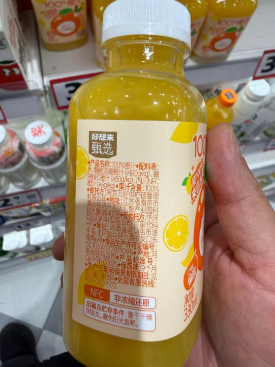 随着市面上果汁类饮品越来越多,“100%”“NFC”字样的标签层出不穷,引发消费者热议。近日,记者走访发现,不少100%果汁配料表首位都是水。而其中好想来自有品牌“好想来甄选”推出的100%果汁产品,代工厂华洋饮品年初就因该问题被市场监管部门处罚。