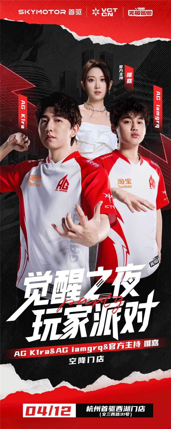 在线下场景方面,首驱也尝试将门店升级为赛事联动空间,融合产品展示、赛事观赛、粉丝互动等功能。此次无畏巡回杭州站期间,西湖区旗舰店将将以“觉醒之夜·玩家派对”为主题,将门店打造为可玩、可社交的玩家据点和城市社交入口。根据安排,活动将于4月12日18时正式开始,现场将设置荧光手绘、NPC对抗、音乐演出等互动环节。VCT CN明星选手AG K1ra、AG iamgrq及无畏契约电竞赛事官方主持唯嘉将以“一日店长”身份到场,参与互动挑t战、签名合影等环节。其间,AG K1ra 还将现场抽奖,奖品包括首驱电动车、亲笔签名照及赛事周边。