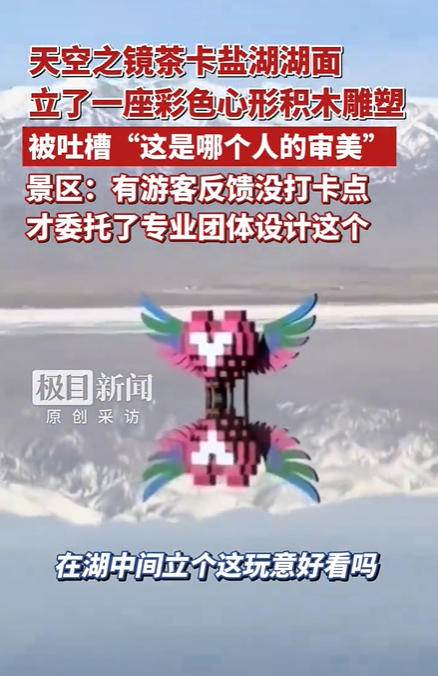 近日,青海茶卡盐湖景区因在湖中央设立红绿蓝配色的心形积木雕塑遭网友吐槽,认为其与自然景观格格不入。景区回应称,此前收到游客反馈缺乏打卡点,故委托专业团队设计该雕塑。