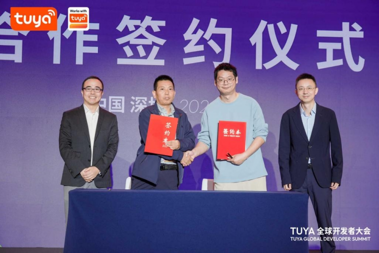 4月23日,2026涂鸦全球开发者大会现场,涂鸦智能与芯讯通完成深度合作协议签署。涂鸦智能联席董事长兼总裁陈燎罕、芯讯通总经理原舒出席仪式,涂鸦智能出行事业部高级产品经理沈秀清、芯讯通总经理特助兼合作事业部总经理邓乾怀代表双方签署协议,共同向行业传递携手赋能全球AI+IoT商用的决心,引发全球开发者与伙伴广泛关注。